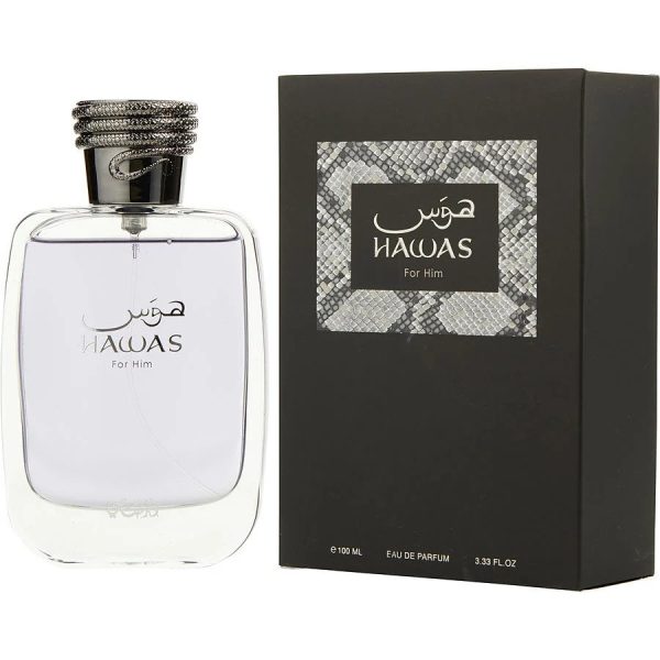 Hawas for Him de Rasasi es una fragancia de la familia olfativa Aromática Acuática para Hombres. Hawas for Him se lanzó en 2015. Las Notas de Salida son manzana, bergamota, canela y limón (lima ácida); las Notas de Corazón son notas acuosas, ciruela, flor de azahar del naranjo y cardamomo; las Notas de Fondo son ámbar gris, almizcle, trozos de madera a la deriva y pachulí.